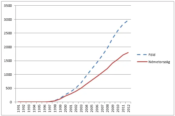 1. ábra A passzív házak számának alakulása 1991 és 2012 között a Földön és Németországban